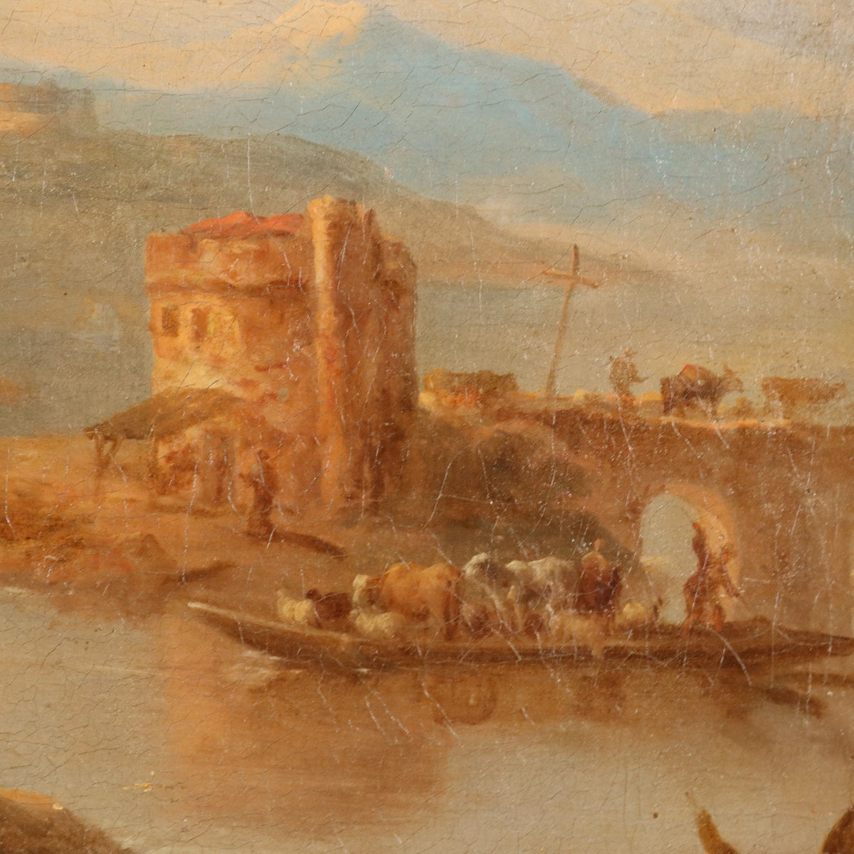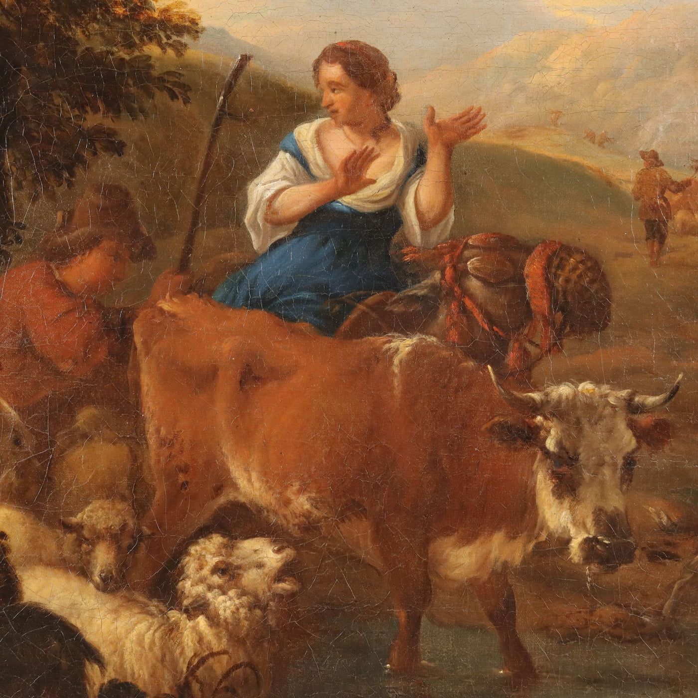 Oil on canvas. Signed lower right. In a splendid classical landscape, with green hills overlooking a watercourse, a stream in the foreground that then becomes a wide river in the distance, are inserted the figures of a shepherd and a shepherdess who lead their flock to water. The pastoral scenes of this type characterized the production of the Dutch artist Michiel Carree, who was court painter to the King of Prussia in the first decades of the 18th century. The painting, in the first canvas, is presented in a contemporary golden frame, in carved and gilded wood. Ancient painting, , art articles, lady's portrait, animal paintings, painting mountain landscape, oil on canvas painting, still life paintings, 1600s painting, italian painters oil on canvas paintings landscapes, painting sea landscape, painting winter landscape, painting autumn landscape, landscape painting, ancient art, religious painting.