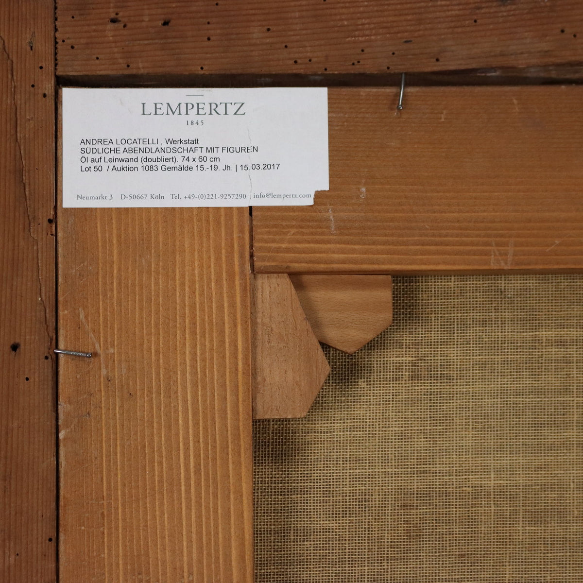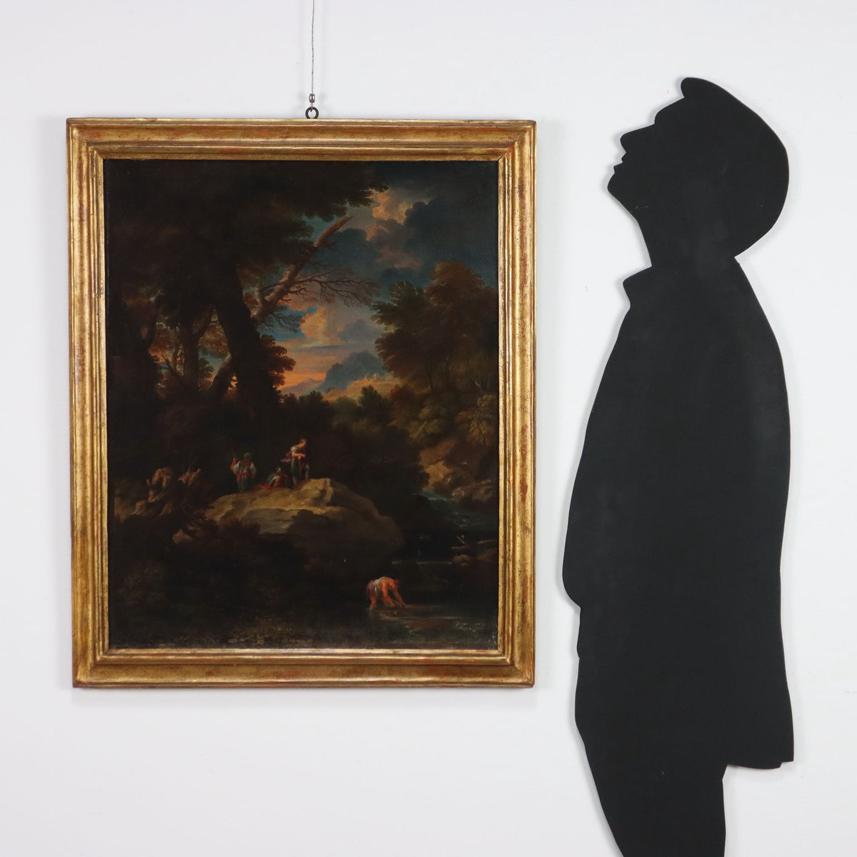 Oil on canvas. Venetian school of the late 17th-early 18th century. Within a large classical landscape, rich in vegetation and with pink atmospheres, there is a small group of soldiers: some, resting on a rock overlooking a stream, are watching one of them who is getting wet, after having placed his armor in the water. The painting was presented at the Lempertz auction in 2017 with an attribution to Andrea Locatelli (1695 -1741) and an estimate of €7/9 thousand; the pictorial methods of the work also seem closer to those of Marco Ricci (1676 -1730), widely taken up by other authors of the Venetian area. Restored and relined, the painting is presented in a late 19th century gilded frame. Ancient painting, , art articles, lady's portrait, animal paintings, painting mountain landscape, oil on canvas painting, still life paintings, 1600s painting, italian painters oil on canvas paintings landscapes, painting sea landscape, painting winter landscape, painting autumn landscape, landscape painting, ancient art, religious painting.