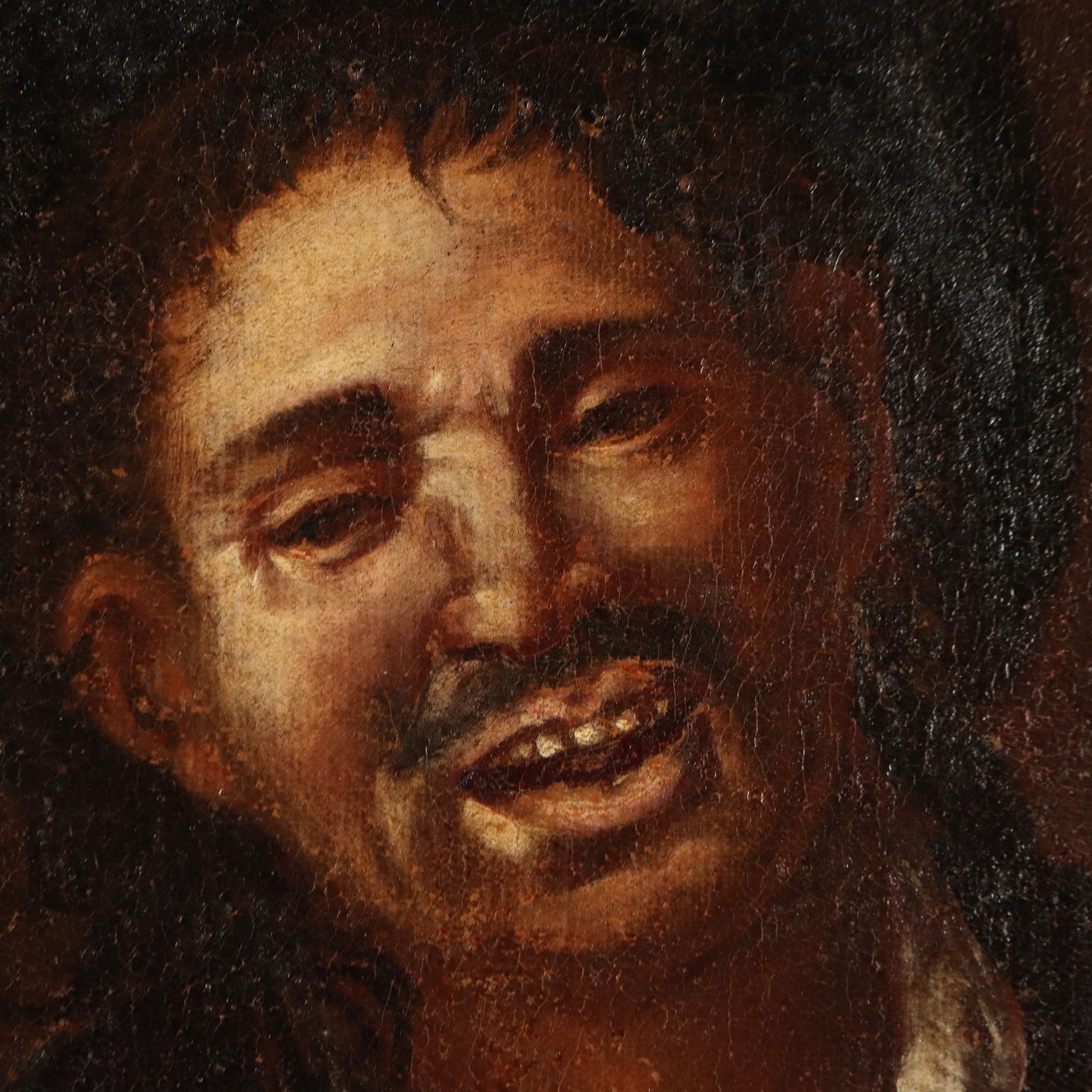 Oil on canvas. The painting harks back in its pictorial methods and subject to the production of Giacomo Francesco Cipper, known as Todeschini, an artist of Austrian origins who established himself in Milan. He was a specialist in market scenes, open-air concerts, card players, and scenes of humble daily life created with laughing caricatures and a search for comic effect. As in this work, which portrays a commoner, intent on drinking wine: despite the poverty that shines through his clothes, the man appears cheerful and laughing, perhaps due to excessive drinking, to represent not the desolation but the vitality and fun of daily life, however miserable. The painting has been restored and relined and features, on the back of the frame, a small cartouche with details of the restoration carried out. It is presented in a readjusted antique frame. Ancient painting, , art articles, lady's portrait, animal paintings, painting mountain landscape, oil on canvas painting, still life paintings, 1600s painting, italian painters oil on canvas paintings landscapes, painting sea landscape, painting winter landscape, painting autumn landscape, landscape painting, ancient art, religious painting.