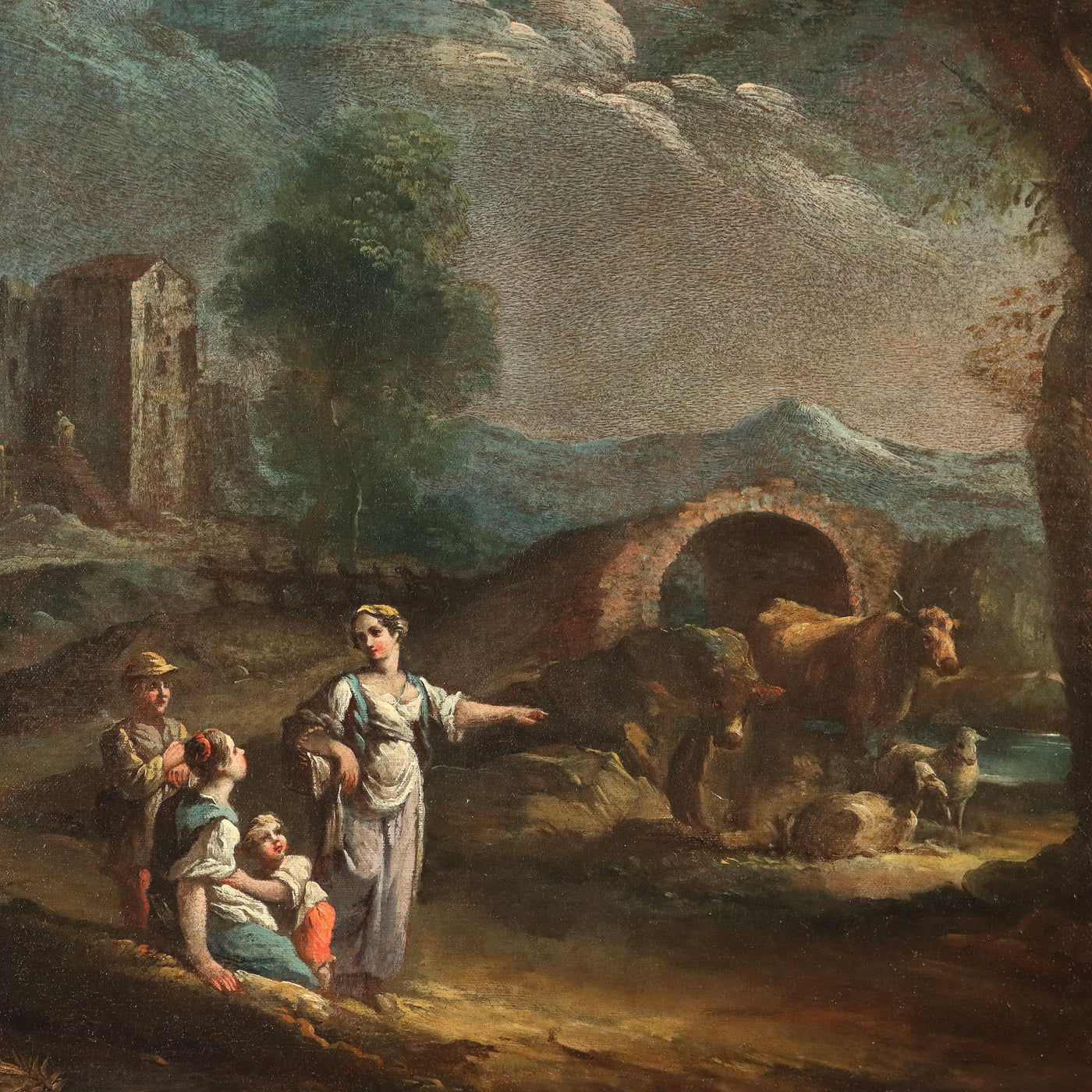 Oil on canvas. Venetian school of the 18th century. The landscape, rather barren and with snow-capped mountain peaks in the background, frames in the foreground a family of shepherds, sitting to rest on the edge of the road outside the village, while their herd drinks from the nearby stream; in the meantime they converse and ask directions to the commoner who passes by on the path with her basket under her arm. Restored and relined, the painting is presented in a period frame. Ancient painting, , art articles, lady's portrait, animal paintings, painting mountain landscape, oil on canvas painting, still life paintings, 1600s painting, italian painters oil on canvas paintings landscapes, painting sea landscape, painting winter landscape, painting autumn landscape, landscape painting, ancient art, religious painting.
