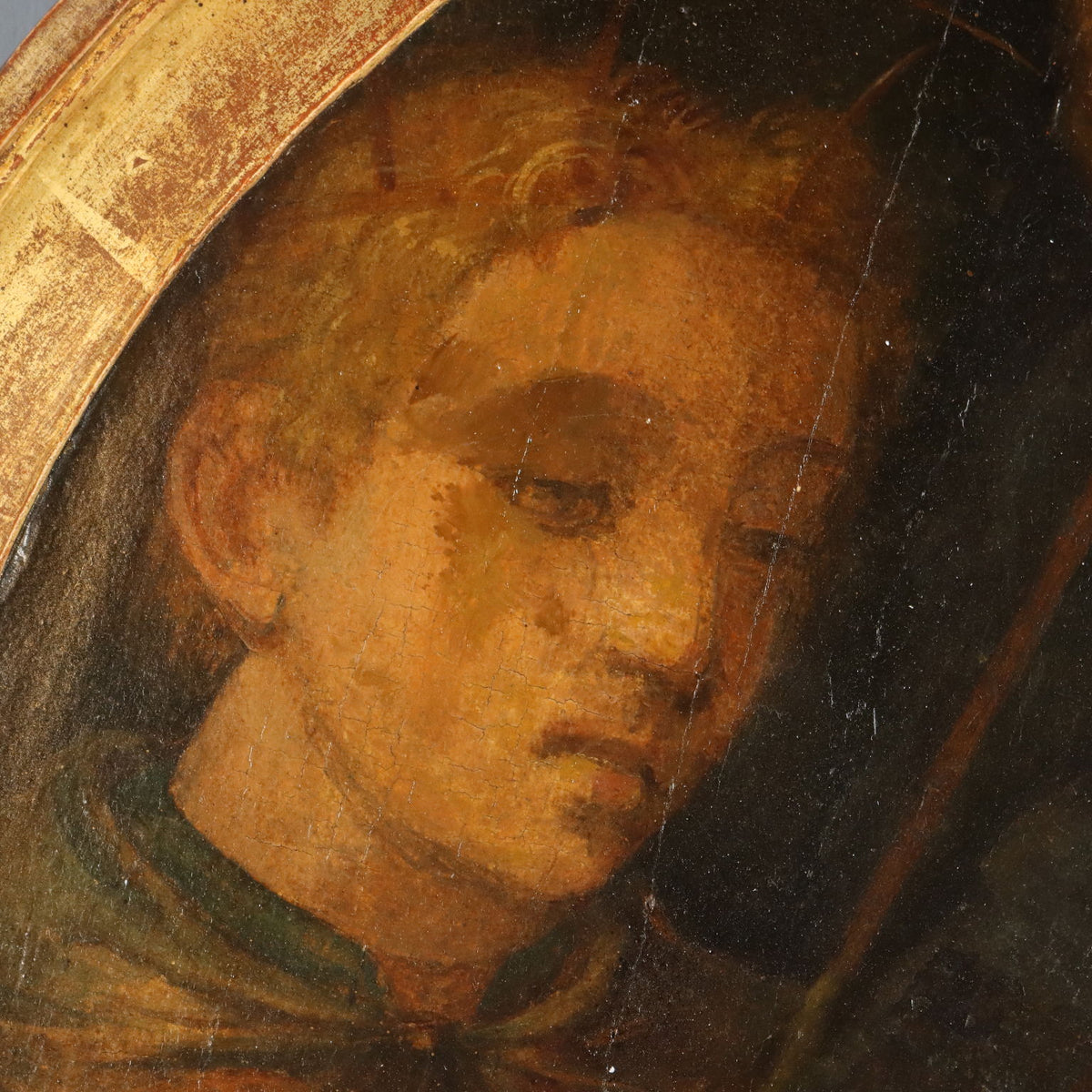 Oil on panel. The work is accompanied by an expert report by Professor Mauro Minardi, who attributes the painting to the work of Bartolomeo Neroni, known as Riccio, an artist active in Siena in the 16th century, through a documented comparison of the pictorial elements of this work with others by the same artist. The painting features a subject that was widely used in the Sienese artistic scene of the 16th century: a Madonna and Child with Saints. In this tondo, Mary is depicted half-length, holding the Baby Jesus, who stands before her on a support surface: the hands of mother and child are intertwined in a gesture of tenderness. To their sides, in the background, are two figures of saints, among those most venerated in Siena: on the right, Saint Catherine, recognizable by her black monastic habit with a white veil and wimple, and holding the traditional lily, a symbol of purity; On the left is a lesser-known saint, Saint Ansanus, a young knight who lived in Siena in the 3rd century, then a Roman colony, where he preached Christianity and was martyred. The young saint is depicted holding a flagpole in one hand and a spherical object in the other, which, according to his iconography, should represent a heart. The work therefore falls within the devotional painting style that was widespread in the 16th century, to which Riccio and his studio devoted considerable effort, given the large number of similar examples that have survived and are attributed to him, thanks in part to fortunate documentation for some of them. The painting's images are inscribed in a gilded frame embossed in the same panel. The back of the panel is reinforced with parquetry. There are some paint losses.