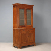 Credenza in noce. Alzata con ante a vetro lavorato, tre ripiani interni, base con coppia di cassetti sotto piano con...