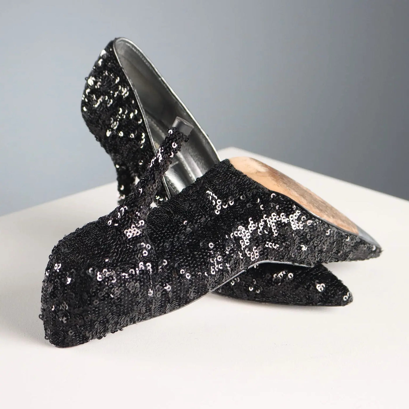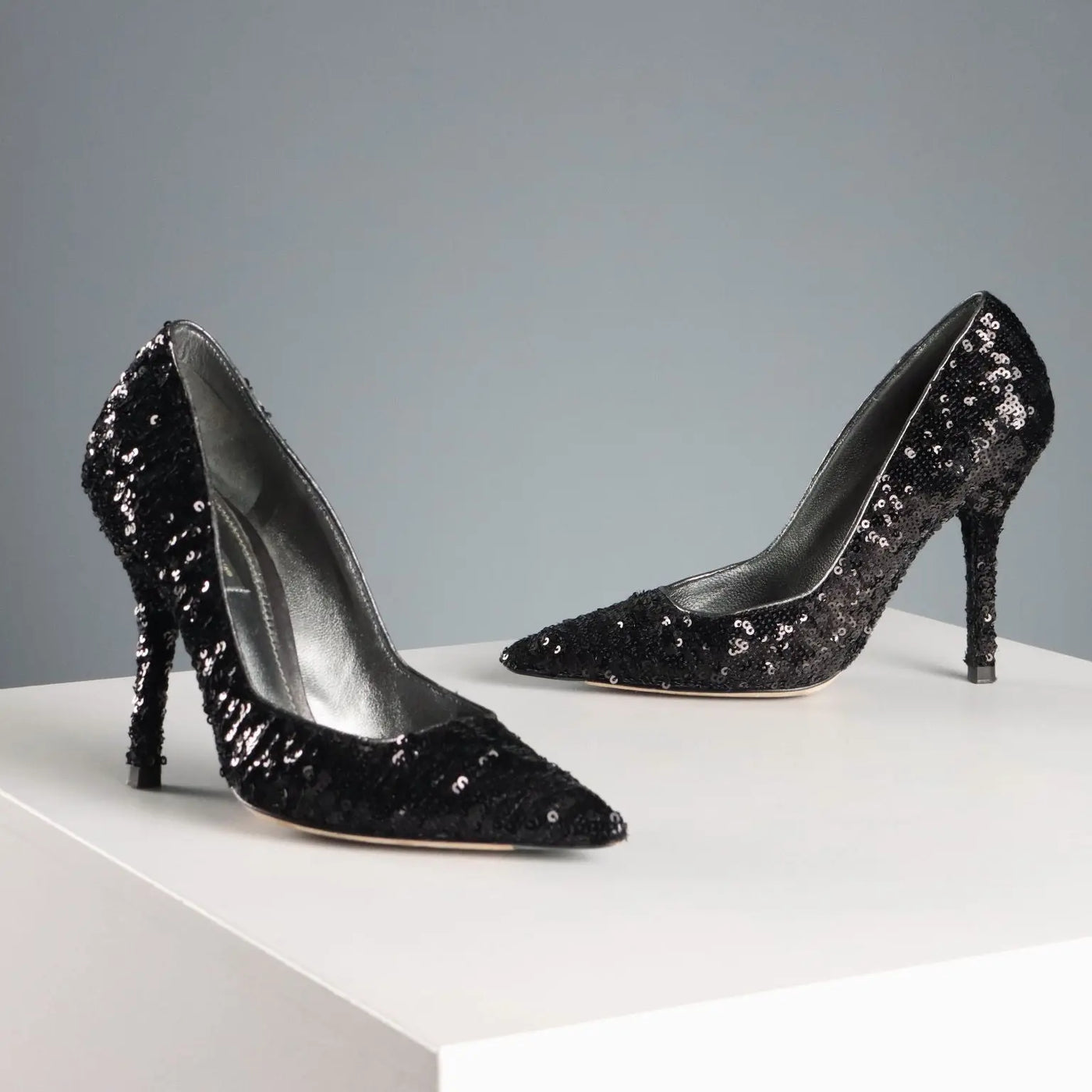 Dolce & Gabbana black sequined pumps, featuring a unique sequined heel and bottom. Heel height: 11 cm. They show minor...
