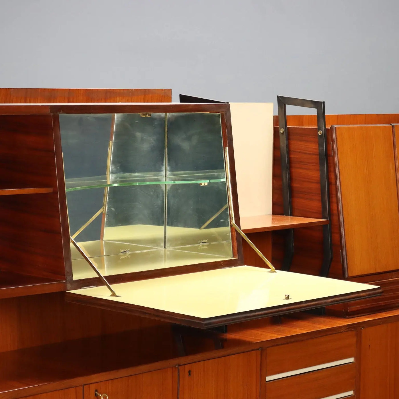 Mobile vintage con vani a giorno e contenitori con anta a ribalta, battente e cassetti. Montanti in metallo smaltato, impiallacciatura...