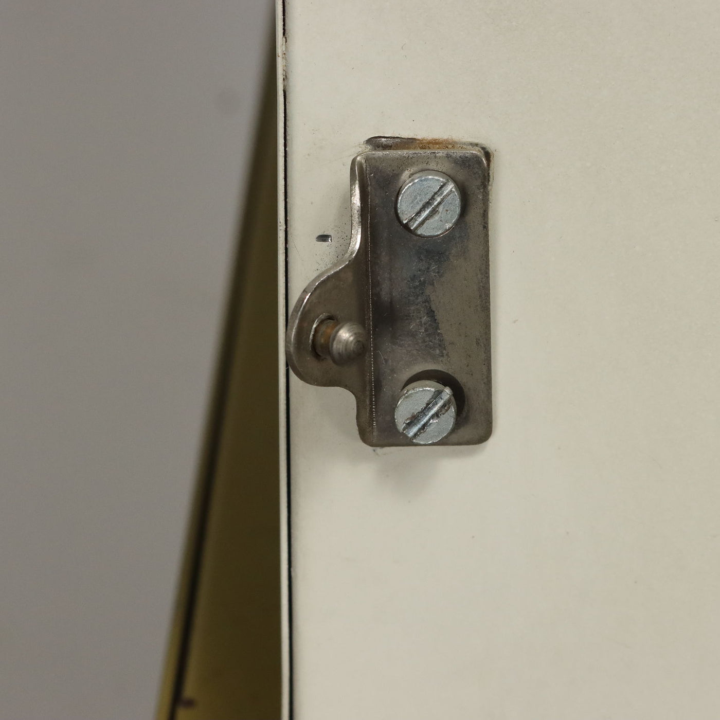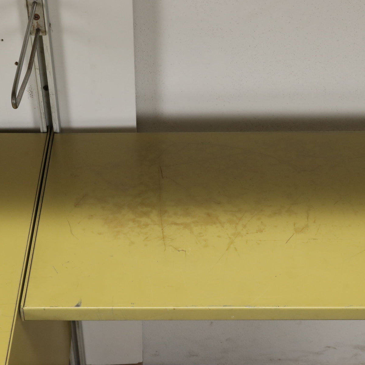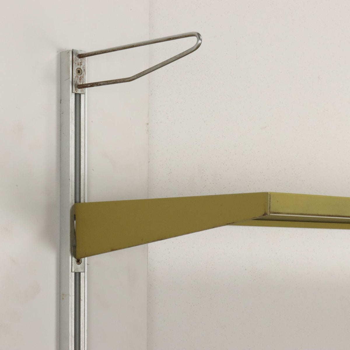 Wall-mounted bookcase requiring wall anchoring, with open shelves and storage elements, uprights made of aluminium and enamelled metal. Bookcases, 1970s bookcase, 1960s bookcase, 1950s bookcase, 1940s bookcase, 1930s bookcase, design bookcase, bookcase.