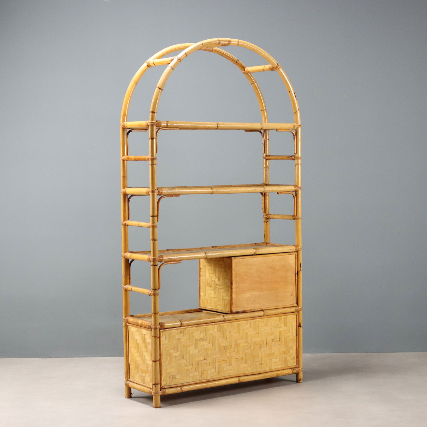 Bookcase with open shelves, hinged-door containers and exposed drawers, bamboo structure and woven bamboo fibre panels. Bookcases, 1970s bookcase, 1960s bookcase, 1950s bookcase, 1940s bookcase, 1930s bookcase, design bookcase, bookcase.