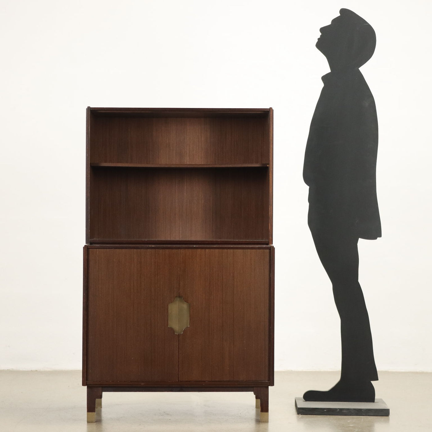 Vintage cabinet with container with hinged doors, open compartment with shelf. Veneered in exotic wood, it stands out for its brass-plated aluminum handles and feet. bar cabinet, design living room cabinet, living room cabinet, highboard, sideboard, buffet, cupboard, vintage furnishing, 1970s cabinet, 1960s cabinets, 1950s cabinets, 1940s cabinets, design cabinets, vintage table, vintage writing desks, vintage chair, vintage chest of drawers, vintage wall lamp.