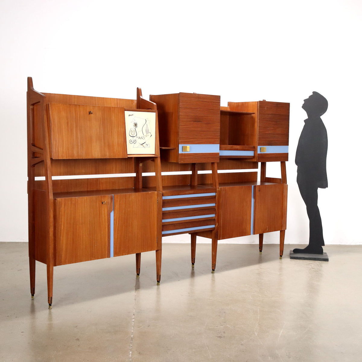 Cabinet with storage compartments with hinged doors, flap, and open drawers. Teak veneer, 'carved' panels and colored laminate inserts. In good condition. bar cabinet, design living room cabinet, living room cabinet, highboard, sideboard, buffet, cupboard, vintage furnishing, 1970s cabinet, 1960s cabinets, 1950s cabinets, 1940s cabinets, design cabinets, vintage table, vintage writing desks, vintage chair, vintage chest of drawers, vintage wall lamp.