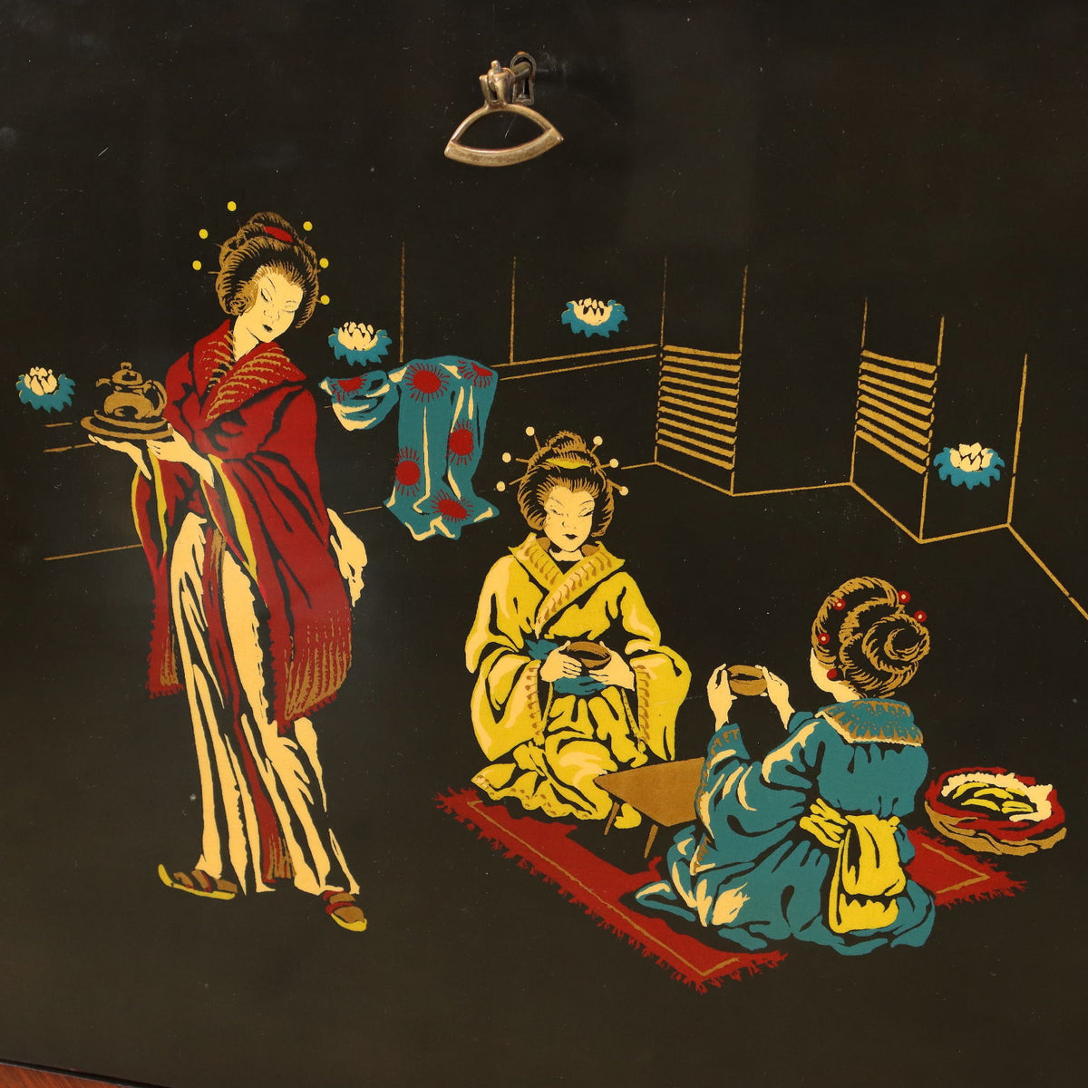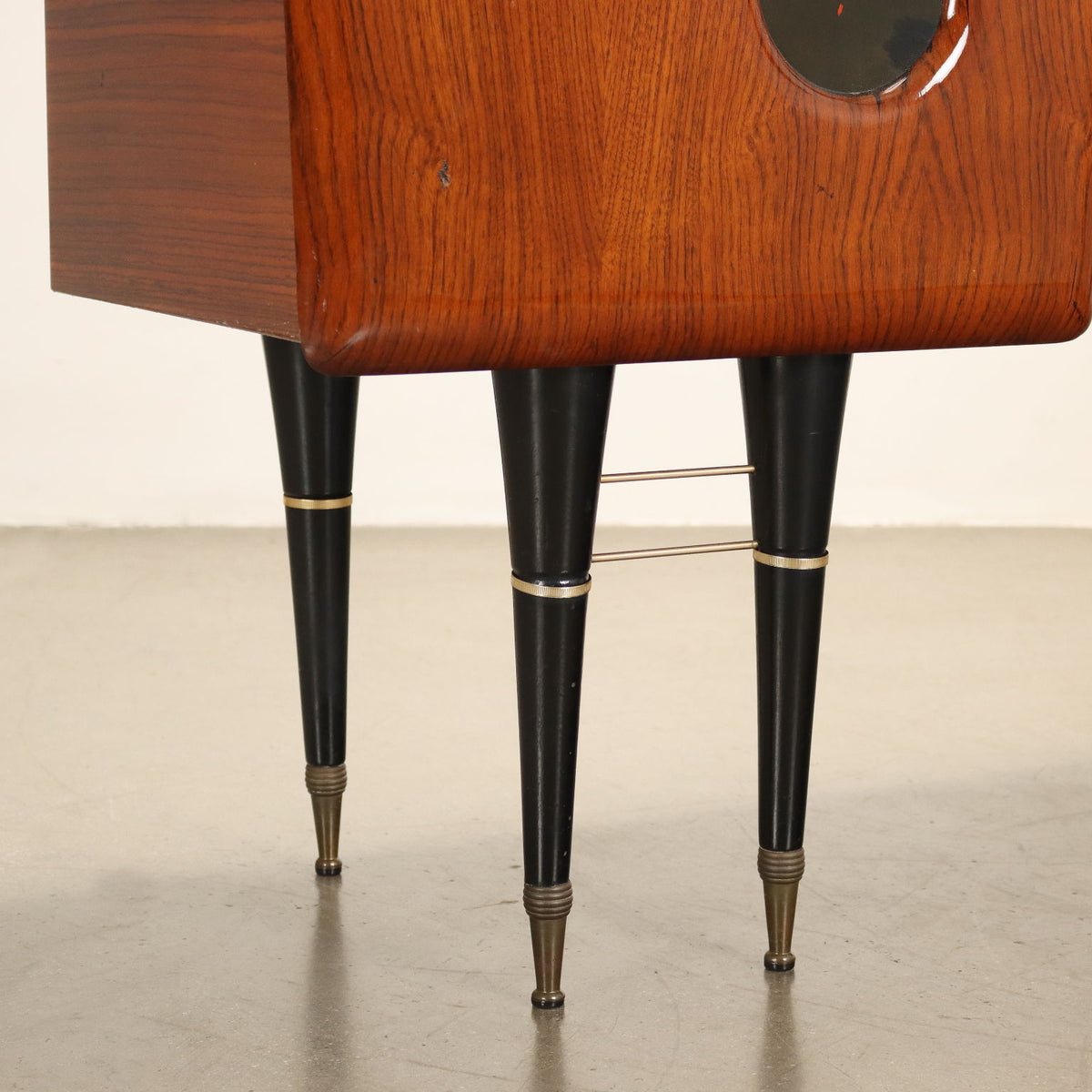 Sideboard with swing doors, exposed drawers and flap for the bar compartment. Exotic wood veneer with polyester finish, decorative designs on lacquered wood, back-treated glass top with marble effect, brass leg tips. bar cabinet, design living room cabinet, living room cabinet, highboard, sideboard, buffet, cupboard, vintage furnishing, 1970s cabinet, 1960s cabinets, 1950s cabinets, 1940s cabinets, design cabinets, vintage table, vintage writing desks, vintage chair, vintage chest of drawers, vintage wall lamp.