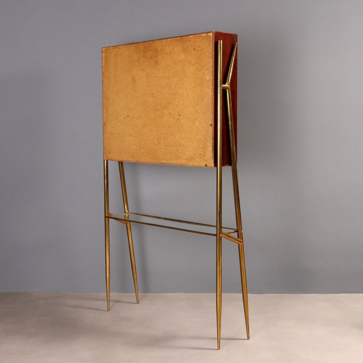 Vintage Italian bar cabinet from the 20th century, featuring a counter with a brass frame, a wooden body with mahogany and exotic wood veneer, open storage compartments with shelves at the back and decorative red Formica panels on the front with brass trim, a red back-treated glass top, and a crystal backsplash. Display cabinet with a brass frame, glass shelf, and wooden cabinet with mahogany and exotic wood veneer, comprising an open compartment and a display cabinet with a mirrored interior and sliding glass doors. Bar counter, design living room cabinet, living room cabinet, highboard, sideboard, buffet, cupboard, chest, vintage furnishing, , 1970s cabinet, 1960s cabinets, 1950s cabinets, 1940s cabinets, design cabinets, vintage table, vintage writing desks, vintage chair, vintage chest of drawers, vintage wall lamp.