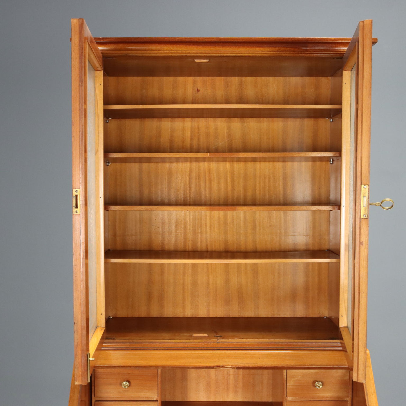 A cabinet with a display case featuring glass shelves and doors, a central drop-leaf door, and a lower compartment with hinged doors. Made in Italy in the 20th century, it features a classic line and a carved trim in the mahogany veneer. bar cabinet, design living room cabinet, living room cabinet, highboard, sideboard, buffet, cupboard, vintage furnishing, 1970s cabinet, 1960s cabinets, 1950s cabinets, 1940s cabinets, design cabinets, vintage table, vintage writing desks, vintage chair, vintage chest of drawers, vintage wall lamp.