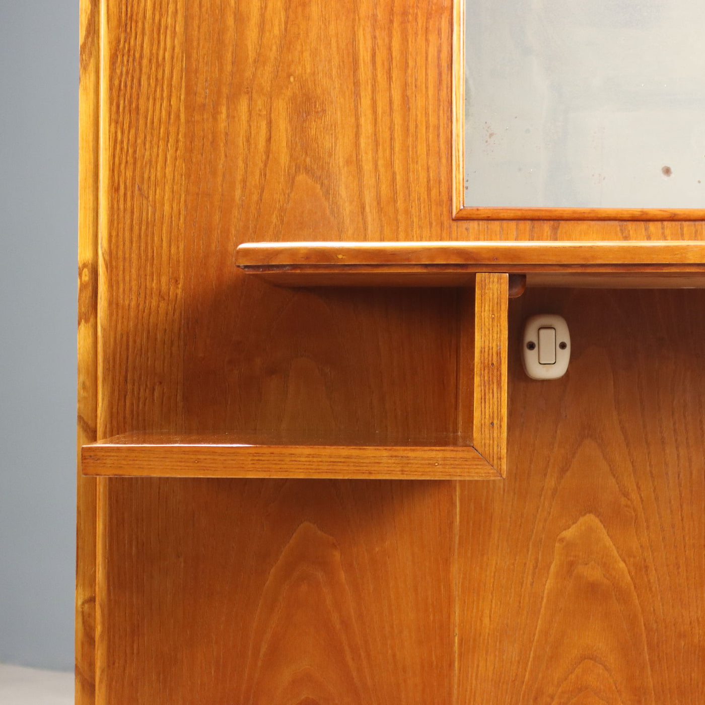 Vintage dressing table of Italian manufacture from the 20th century made of oak veneer with stool, shelf and small chest of drawers, mirror and light point from the 1970s, overhauled and in working order. bar cabinet, design living room cabinet, living room cabinet, highboard, sideboard, buffet, cupboard, vintage furnishing, 1970s cabinet, 1960s cabinets, 1950s cabinets, 1940s cabinets, design cabinets, vintage table, vintage writing desks, vintage chair, vintage chest of drawers, vintage wall lamp.
