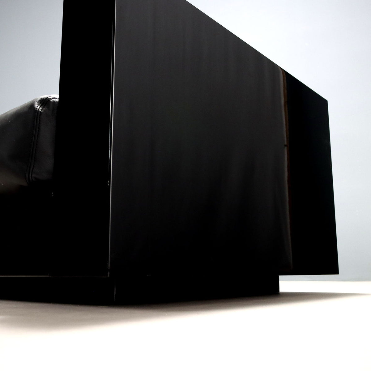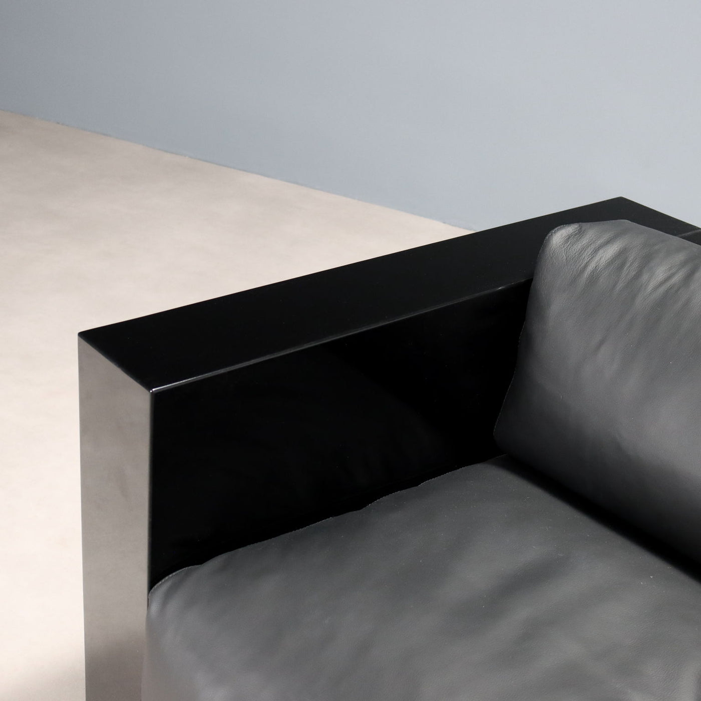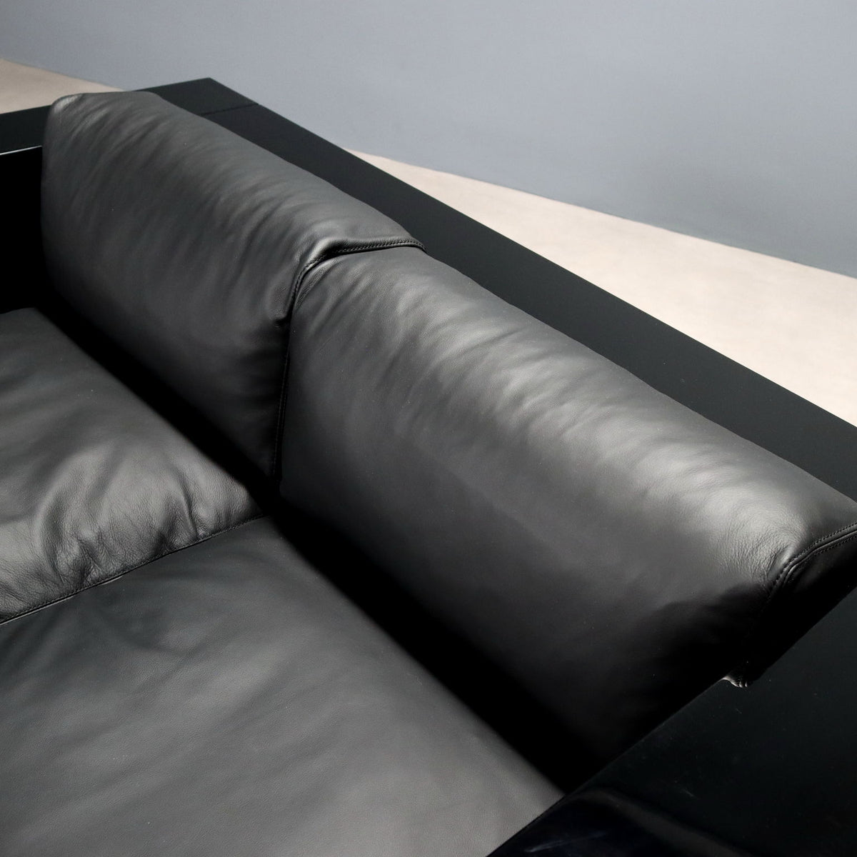 Two-seater sofa with black lacquered wood frame, foam-filled cushions, and black leather upholstery. Featuring the 'Centro Studi Poltronova' manufacturing logo. small soda, vintage small sofa, 1980s sofa, 1970s sofa, 1960s sofa, 1950s sofa, 1940s sofa, vintage sofa, design sofa.