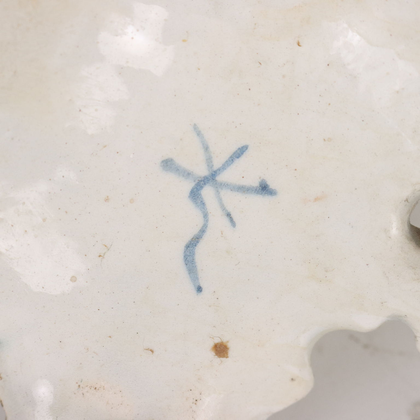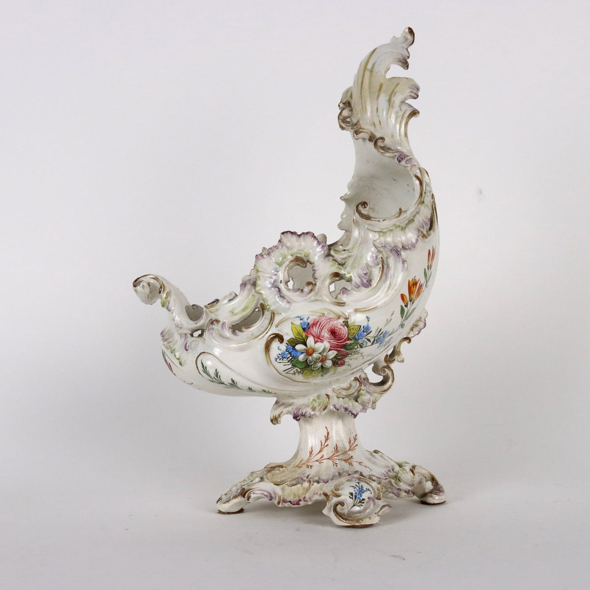 Leaf-shaped majolica centerpiece with polychrome flower and rocaille decorations. Manufacture mark under the base. vases, service, plates, small sculptures, terracotta, porcelain, majolica, earthenware, ceramics, collector's articles, ancient objects.
