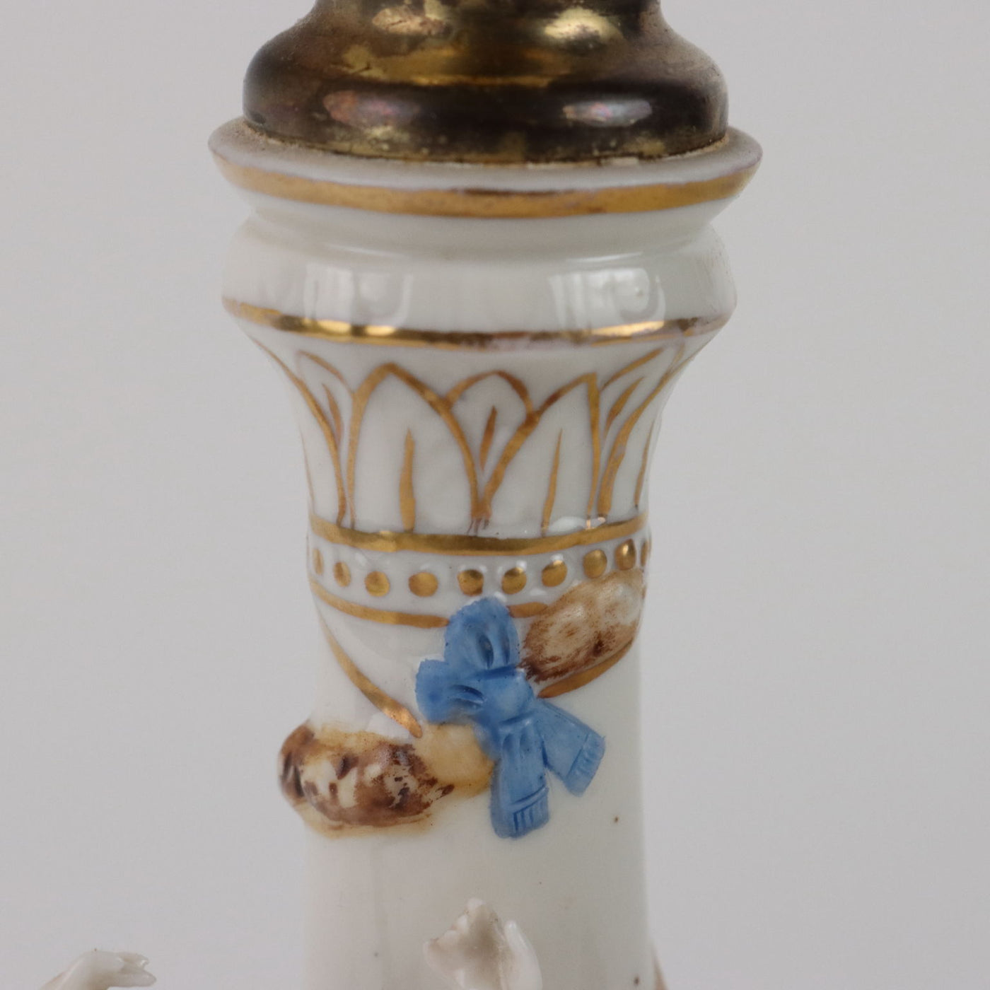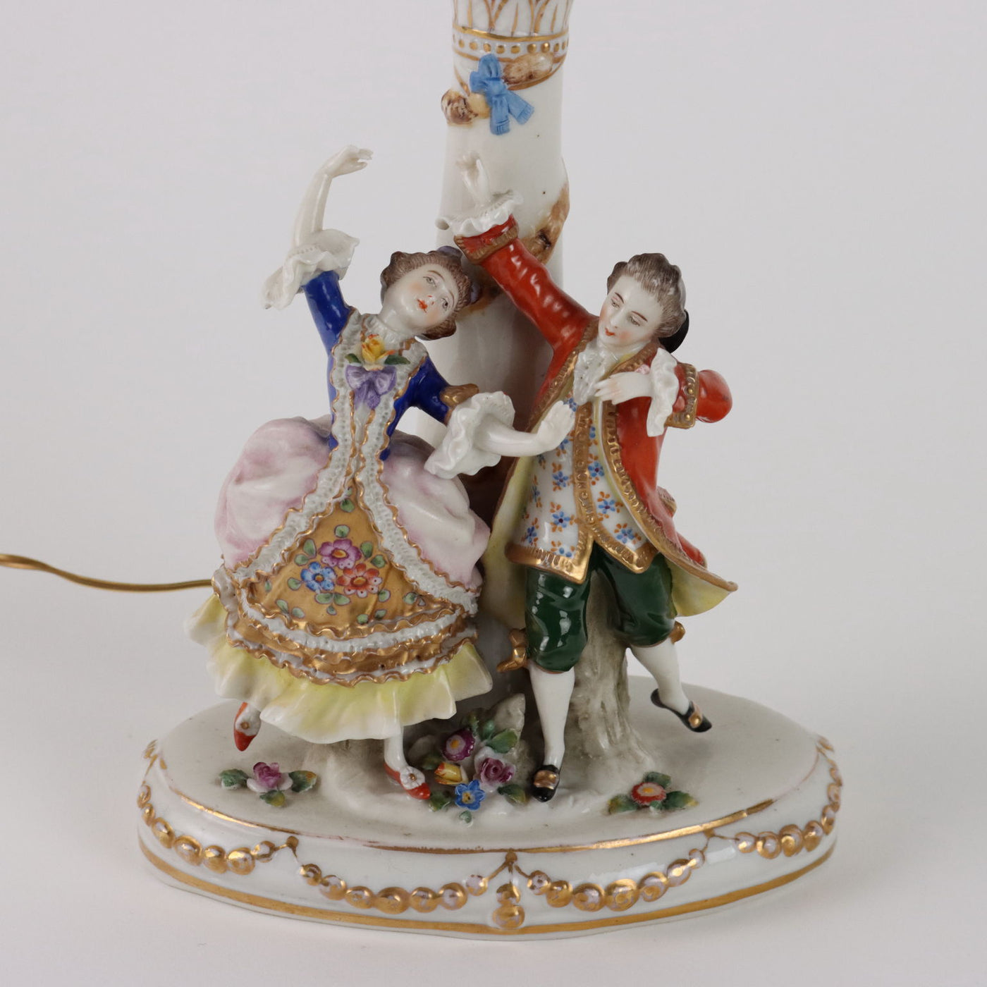 Finely crafted and decorated porcelain figurine depicting a gallant couple dancing. The manufacturer's mark is under the base. It forms the base for a lampshade. collector's articles, ancient objects, porcelain, ceramics.