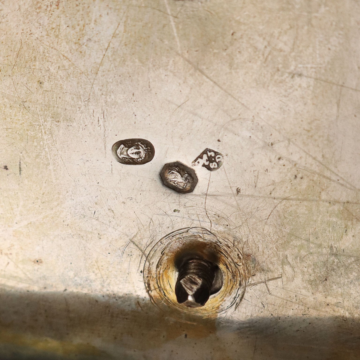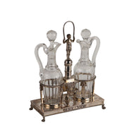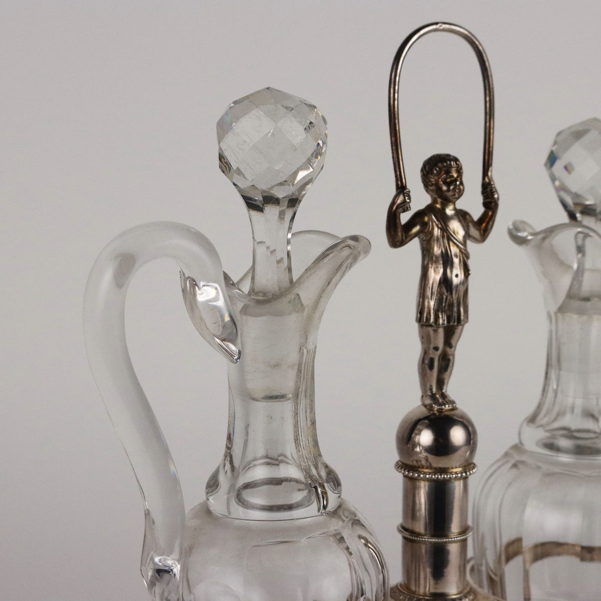 Molten, embossed and chiseled silver vinegar bottle, non-coeval cut crystal ampoules. Paris, master goldsmith “SJ Dupezard”, first quarter of the 19th century. Elegant model with plinth-shaped main body supported by four feral paws placed at the corners, four circular compartments, of which the two larger ones each hold an ampoule, each consisting of three musician putti with a herm-shaped body. Central section with applied neoclassical dolphin, connecting band decorated with anthems and a pair of masks depicting the Greek god Dionysus, raised column with a three-quarter sphere top culminating with a figure of a boy dressed in old-fashioned clothing, which supports the handle for the catch. Decorative apparatus completed by Greek leaves, beads and floral applications placed on the two long sides of the base plinth. Engraved monogram; it features hallmarks of the goldsmith, title, city guarantee and an unofficial one used by the Association des Orfévres. 756 grams. Ancient objects, , collector's articles, candle-holder.