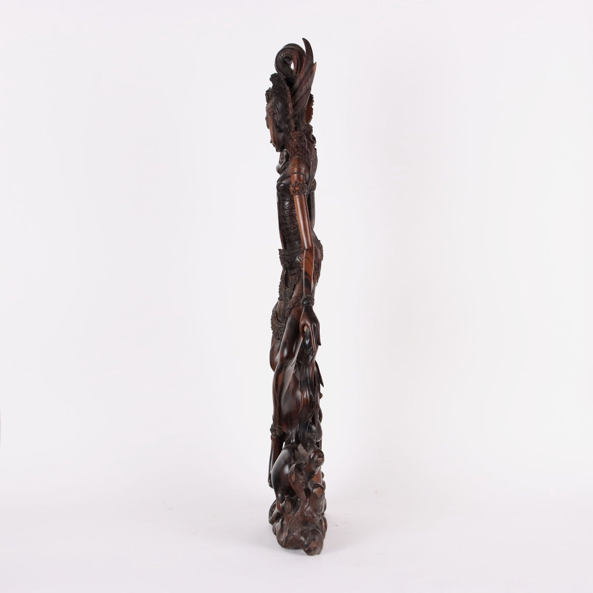 Elegantly carved large female sculpture in teak wood in the round. The figure is represented in a plastic position and with great detail in the ornaments. Sculptures ancient objects, , ancient art, sculpture, statue.