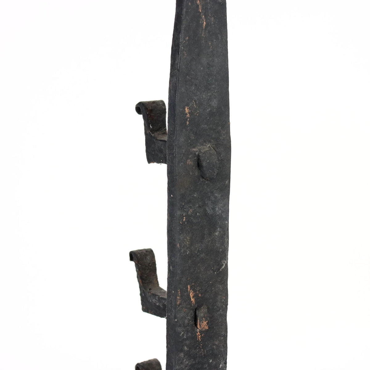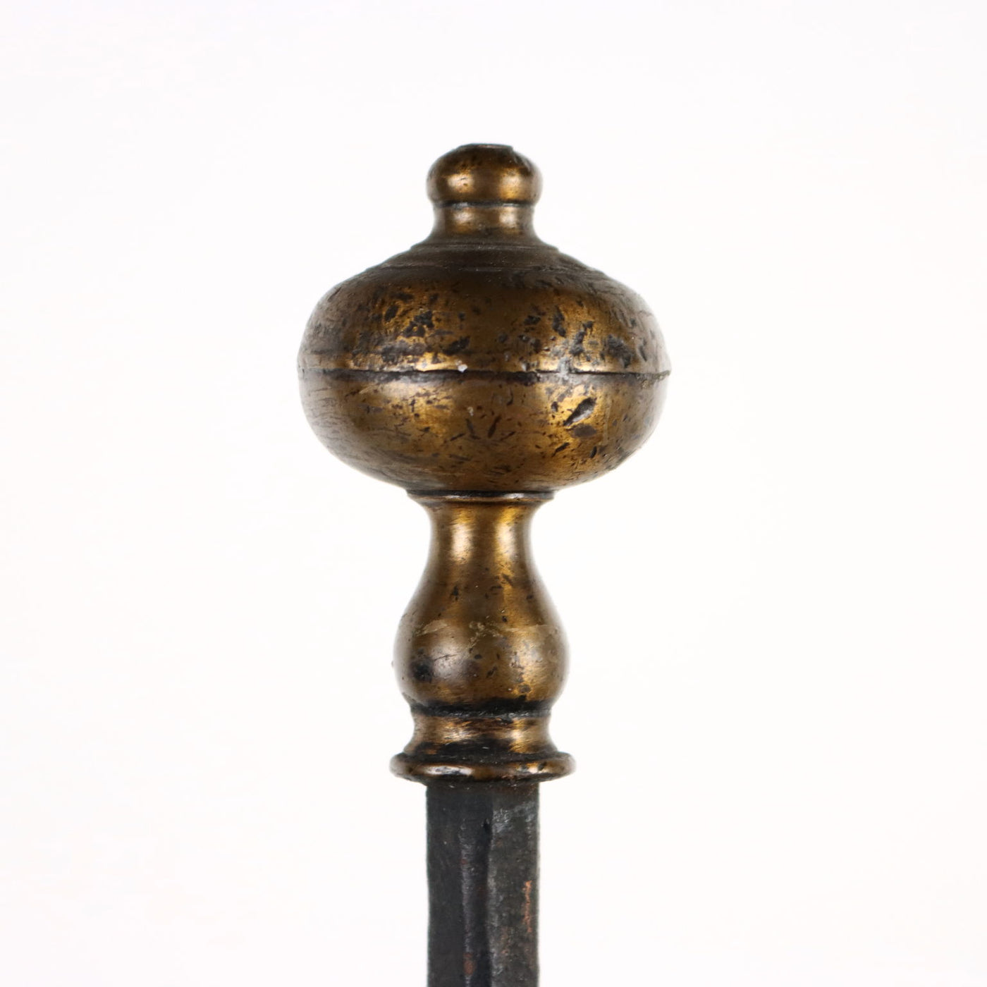 Pair of wrought iron fireplace andirons. At the top there are gilded bronze knobs. Ancient objects, , collector's articles, candle-holder.