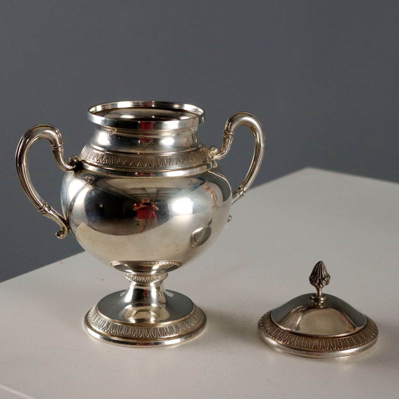 Two-handled sugar bowl in chiseled silver with a pine cone handle. Silver hallmarks incised under the base. The silversmith's mark is barely legible. 250 grams. Ancient objects, , collector's articles, candle-holder.