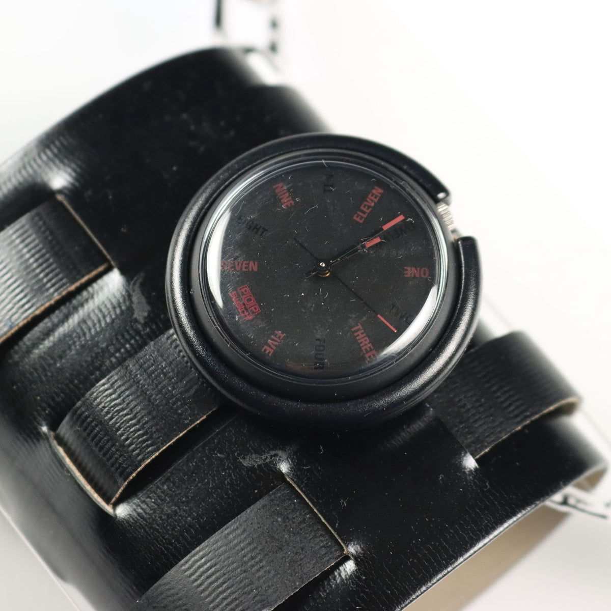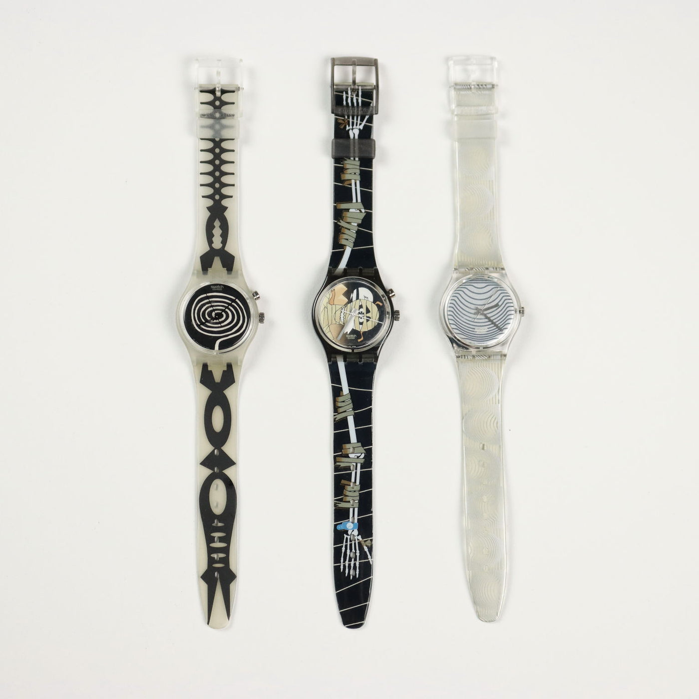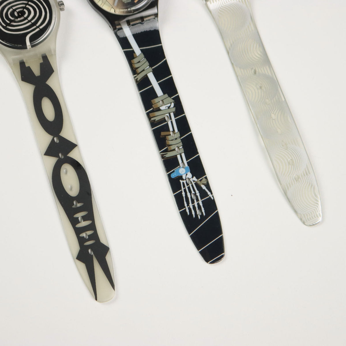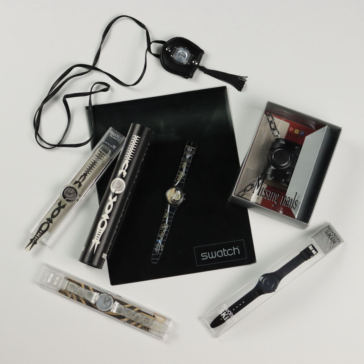 Set of 6 'Noir' themed watches. Victor Vasarely GK231, Pop Swatch Missing Nails, Mummy Loom GM900, Signalite GK903, Swatch in fringed strap, Skin Mono Blue SF100D. Vintage objects, vintage objects, 1960s articles, 1970s articles, 1930s articles, 1940s objects, 1950s objects, design articles.