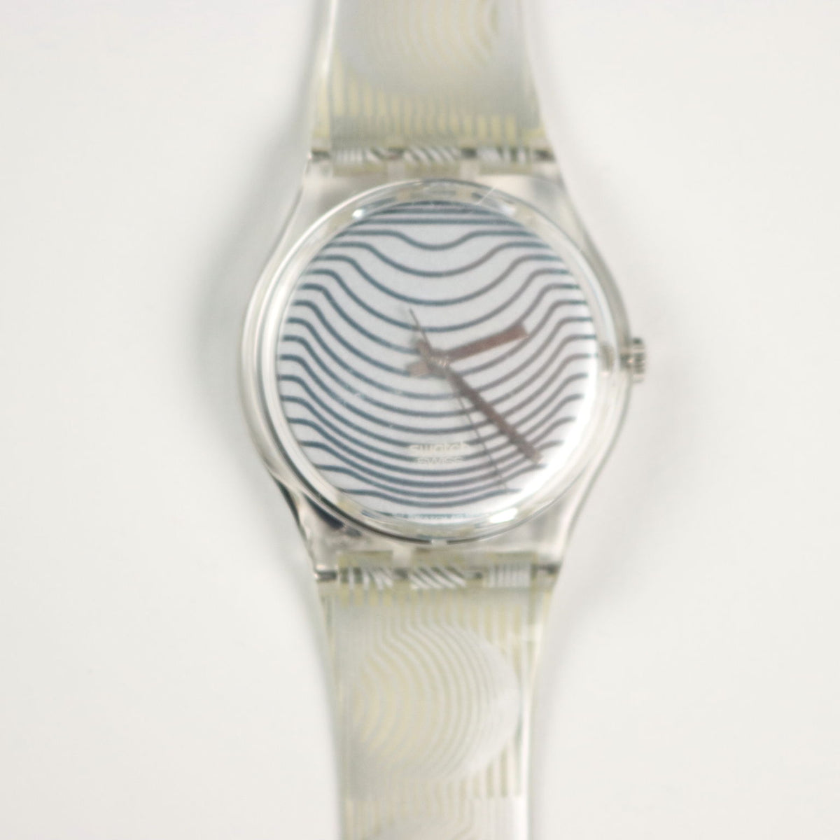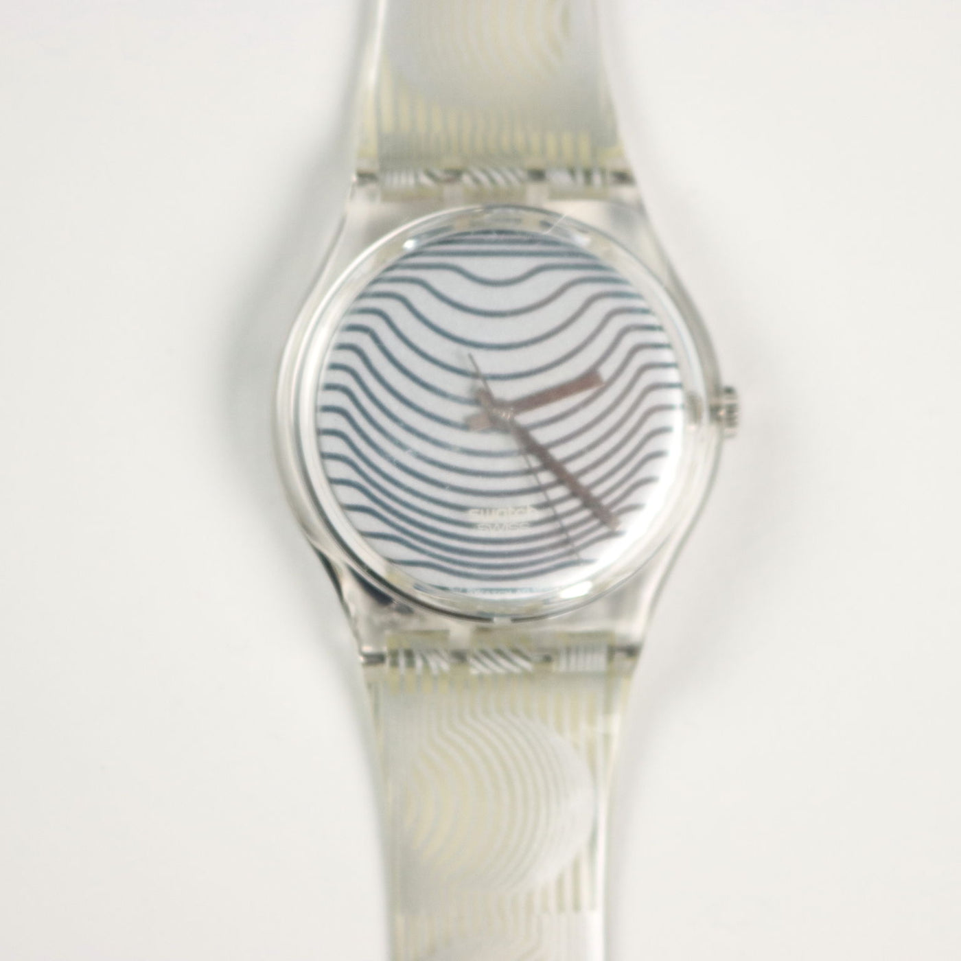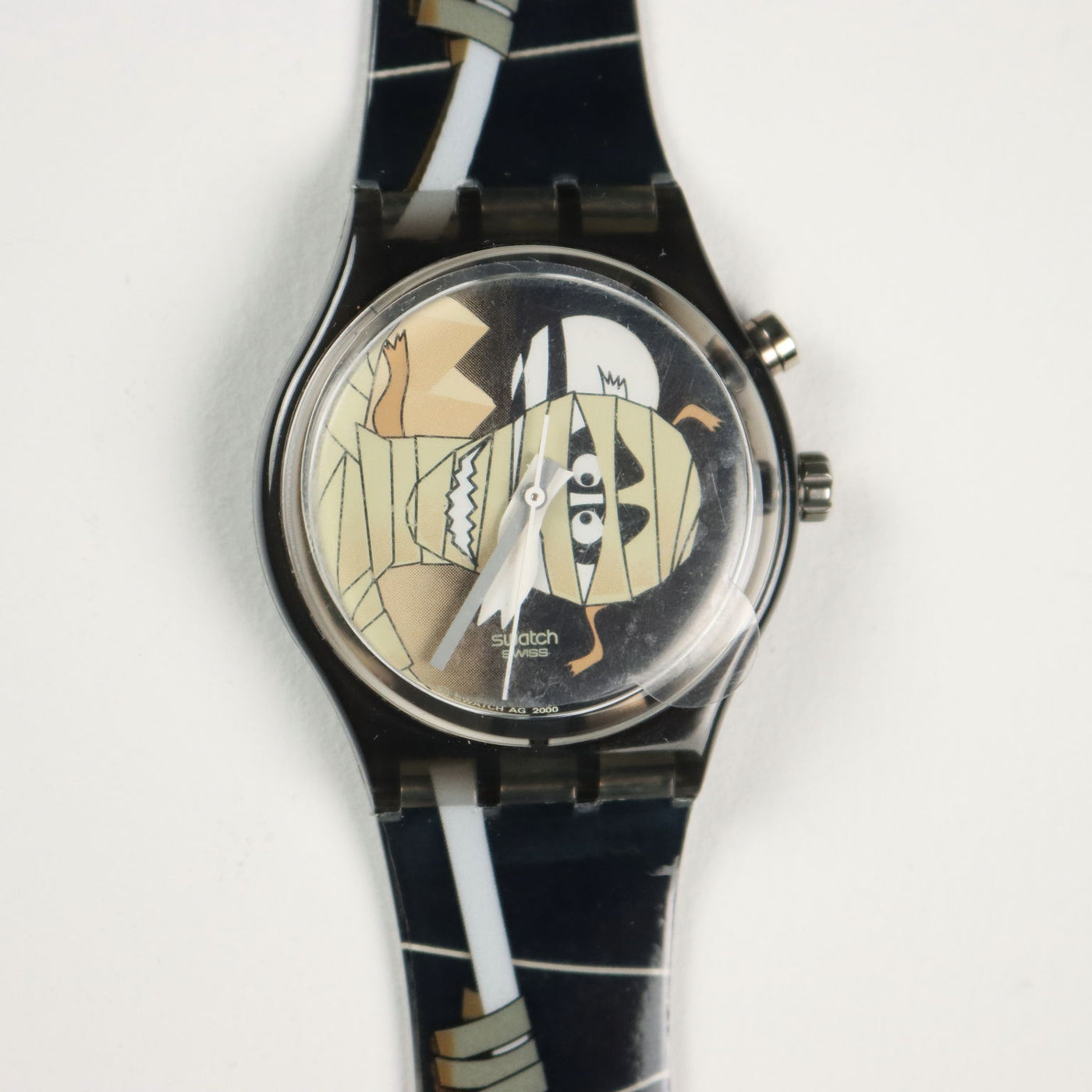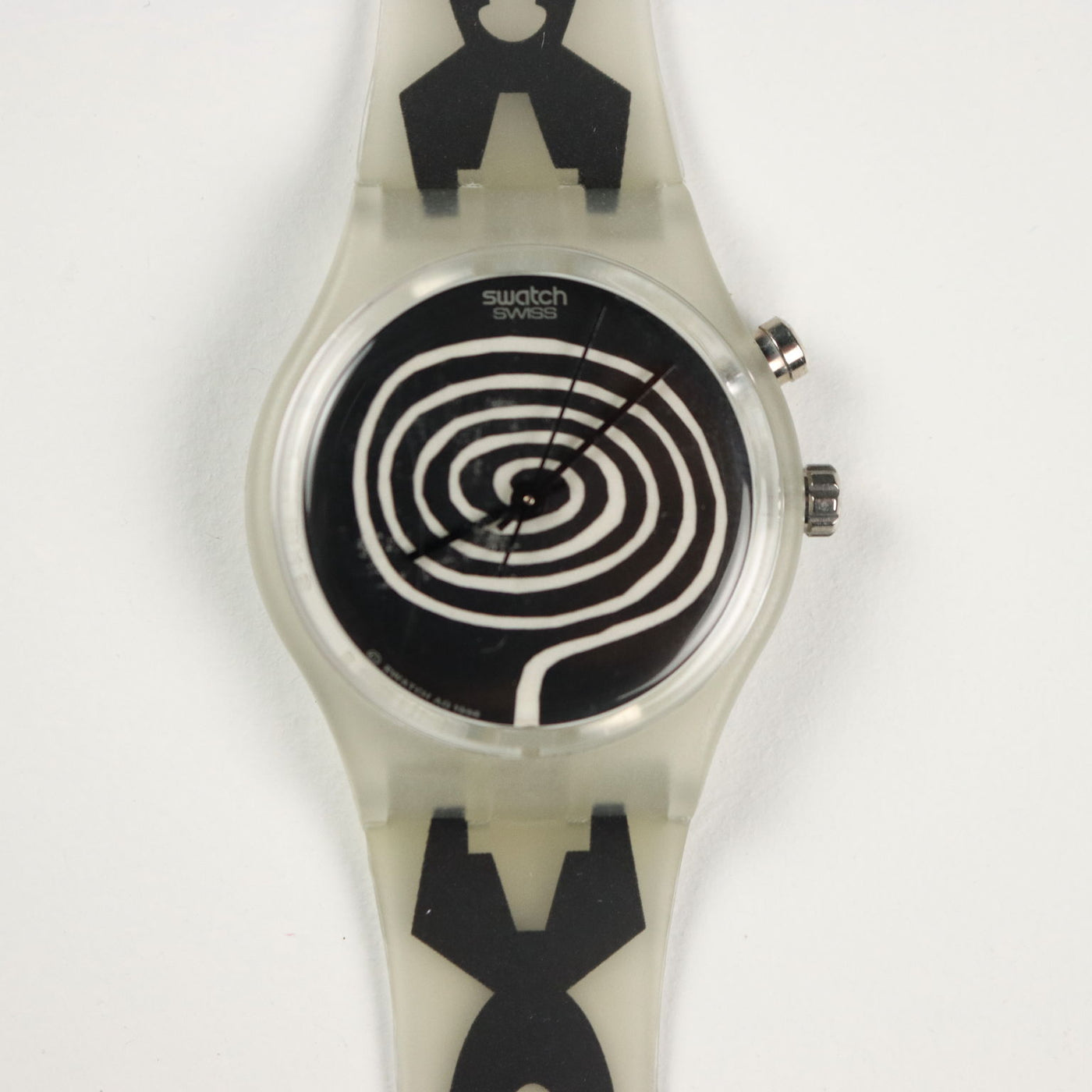 Set of 6 'Noir' themed watches. Victor Vasarely GK231, Pop Swatch Missing Nails, Mummy Loom GM900, Signalite GK903, Swatch in fringed strap, Skin Mono Blue SF100D. Vintage objects, vintage objects, 1960s articles, 1970s articles, 1930s articles, 1940s objects, 1950s objects, design articles.