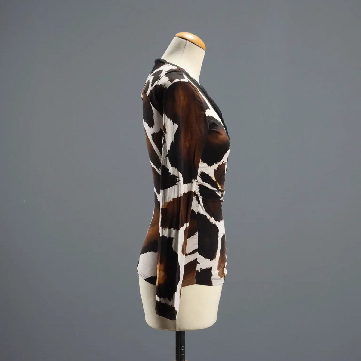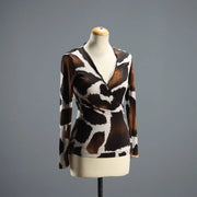 Animal-print viscose sweater with a crossover neckline and a silk trim. The brand's hologram is visible inside.
