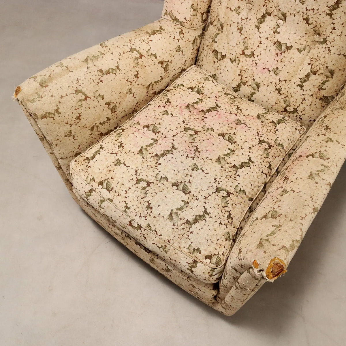 Vintage armchair with foam and spring padding, a down cushion, and original period floral fabric upholstery. This seat lends itself...