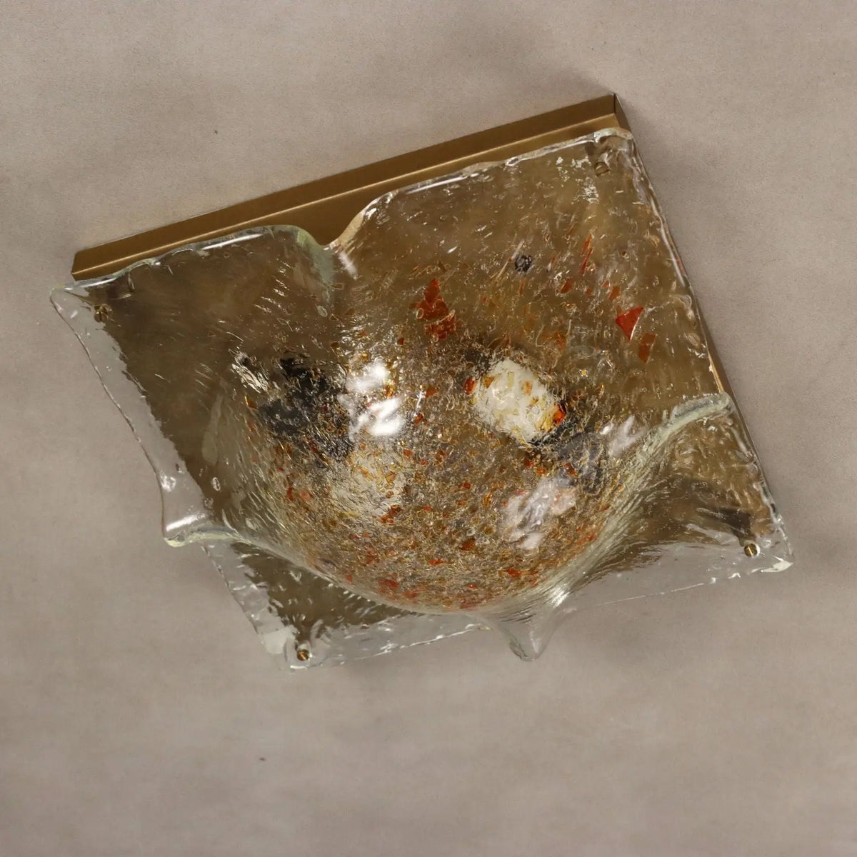 Vintage ceiling lamp with metal frame and transparent curved and worked glass diffuser with orange decorations. Good condition.